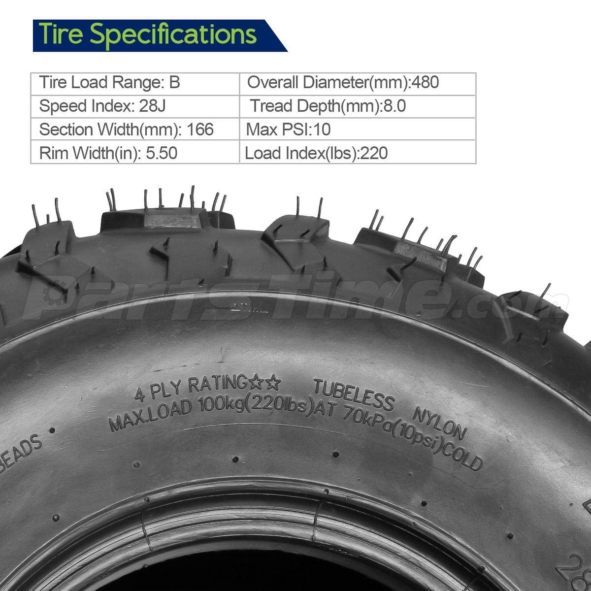 - 4 Ply, load range B, Pattern Depth: 8 mm, Rim Width: 5.5", 235lbs@10psi, load/speed rate:28J.