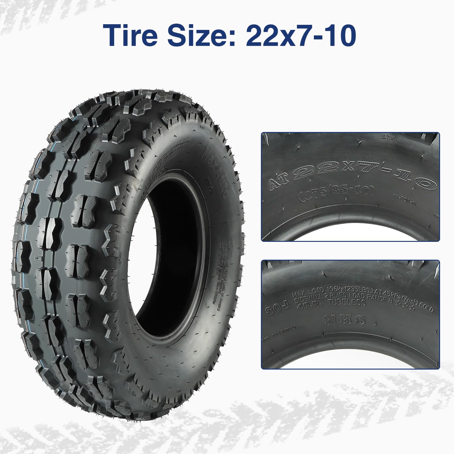 - ć22x7-10ćThis 22x7x10 ATV Tires front Tire which can be used for front ATV tires quad sport ATV UTV tires. Before to buy, please make sure the Brand Logo "MaxAuto"