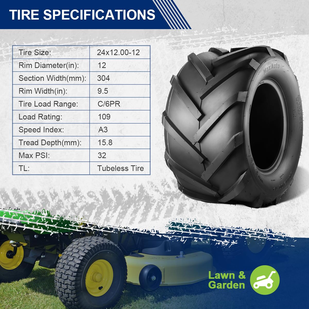 - 【Compatibility】Heavy duty 6 ply tubeless 24x12.00-12 lawn mower tires, 24x12.00-12, 24x12-12, 24x12x12, 24 12 12 tires is widely used on many kind of lawn mower, riding lawn mower, lawn tractor, garden tractor, riding mowers, tTillers, trenchers, other farm equipment.