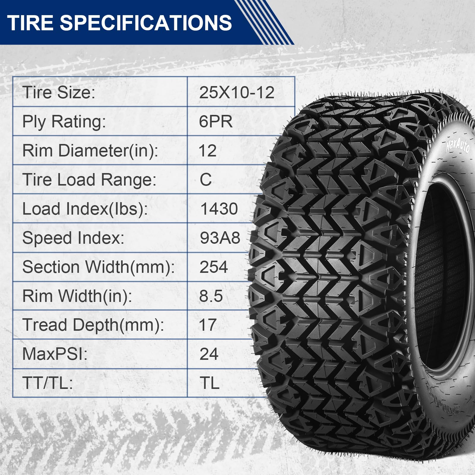 MaxAuto 25x10-12 All Trail ATV Tire, 6-Ply Load Range C, Heavy-Duty Off-Road Traction(1PC)â