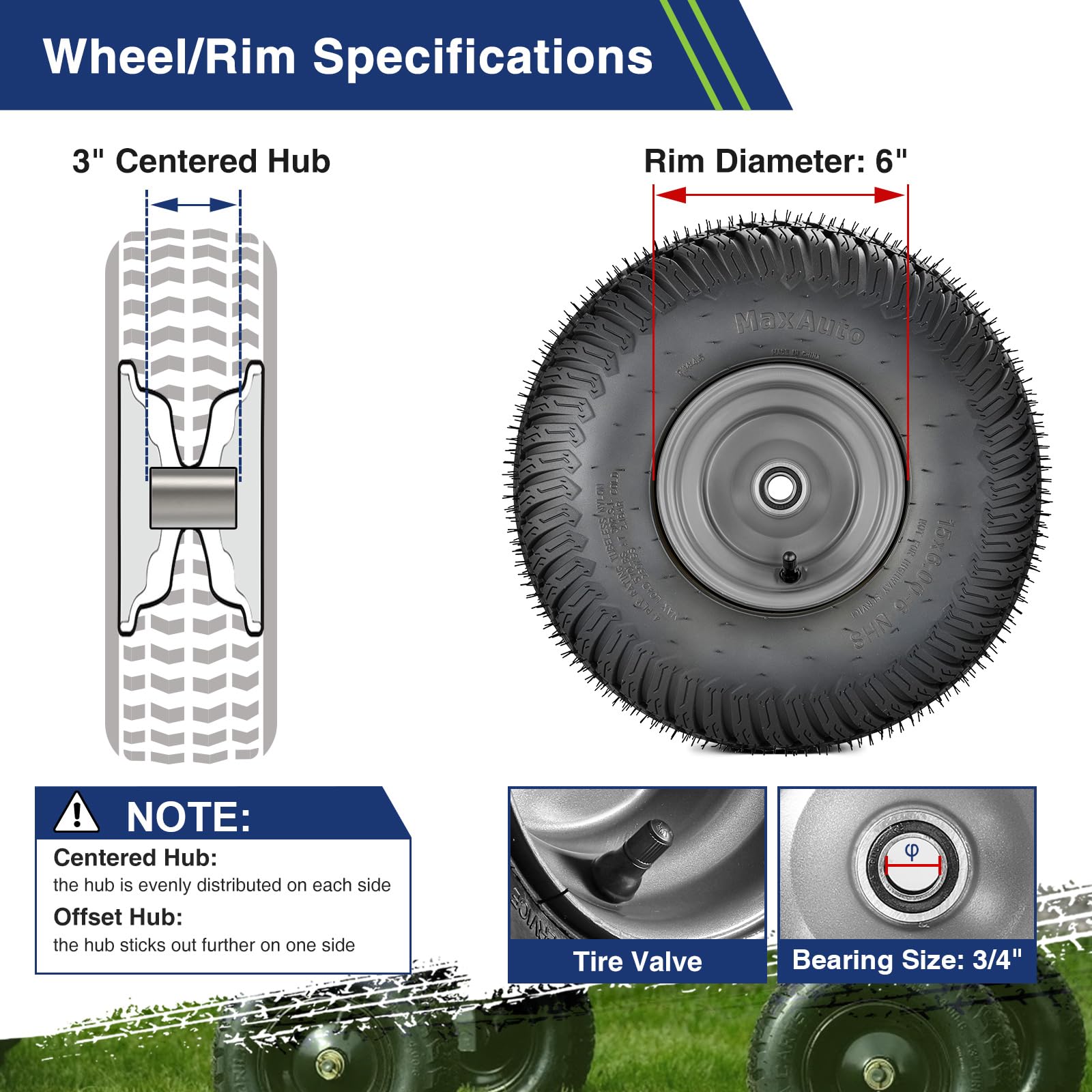 - ćParameterćTire Size: 15X6.00-6"; Hub Type:Centered Hub; Hub Length: 3"(could extend to 3.5''-4.0''-4.5'' with different size spacers); Bearing Diameter: 3/4" (could change to 5/8'' bushing); Load Capacity: 570lbs; Type: Pneumatic Tubeless Tires; 4Ply (!!!Tire equipped with Air Valve, without Grease fitting!!!)