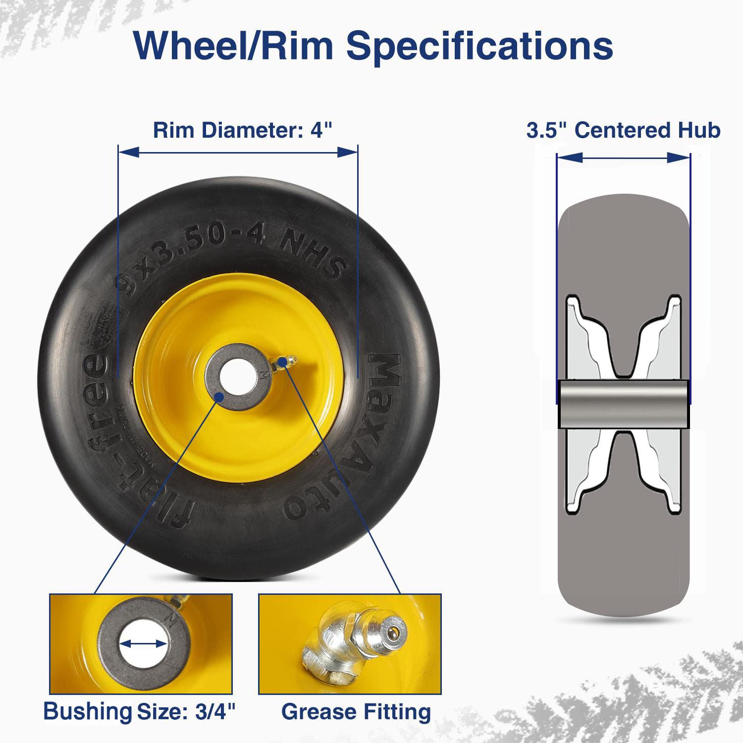 MaxAuto 9x3.50-4 Flat Free Lawn Mower Tires, 9x3 50 4 Lawnmower Wheel Assemblies, Smooth Tread Zero Turn Tire for King Kutter/Scag/Kubota Riding Mowers, 3.5" Centered Hub, 3/4" Bushings, 2 Pack