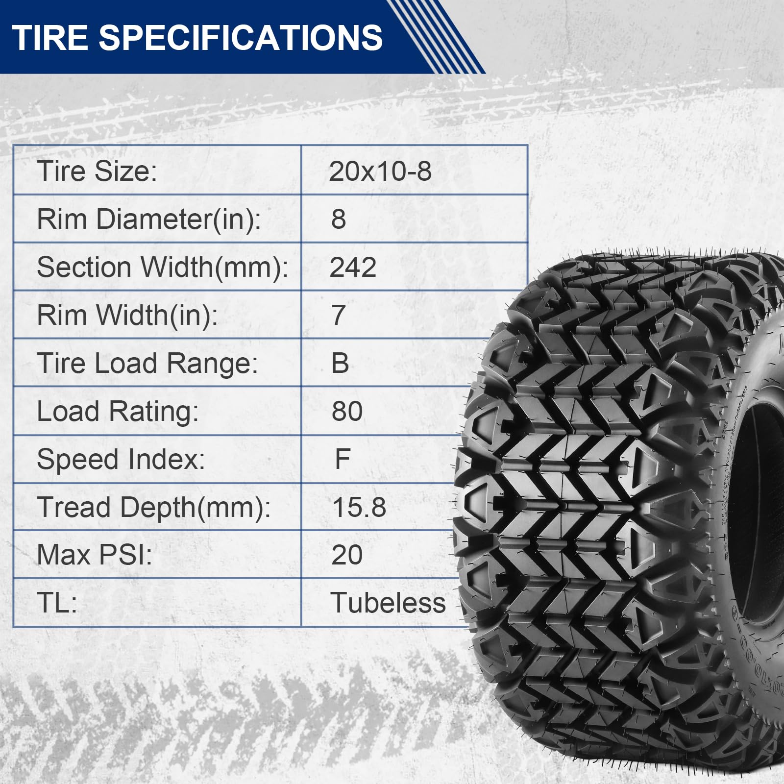 - Tire Parameters: Size: 20x10-8, tread depth: 0.62"; rim width: 7”; tubeless; max load; 1235 lbs; load/speed index: 80F; psi: 20 (Please check the original tire size before purchasing)