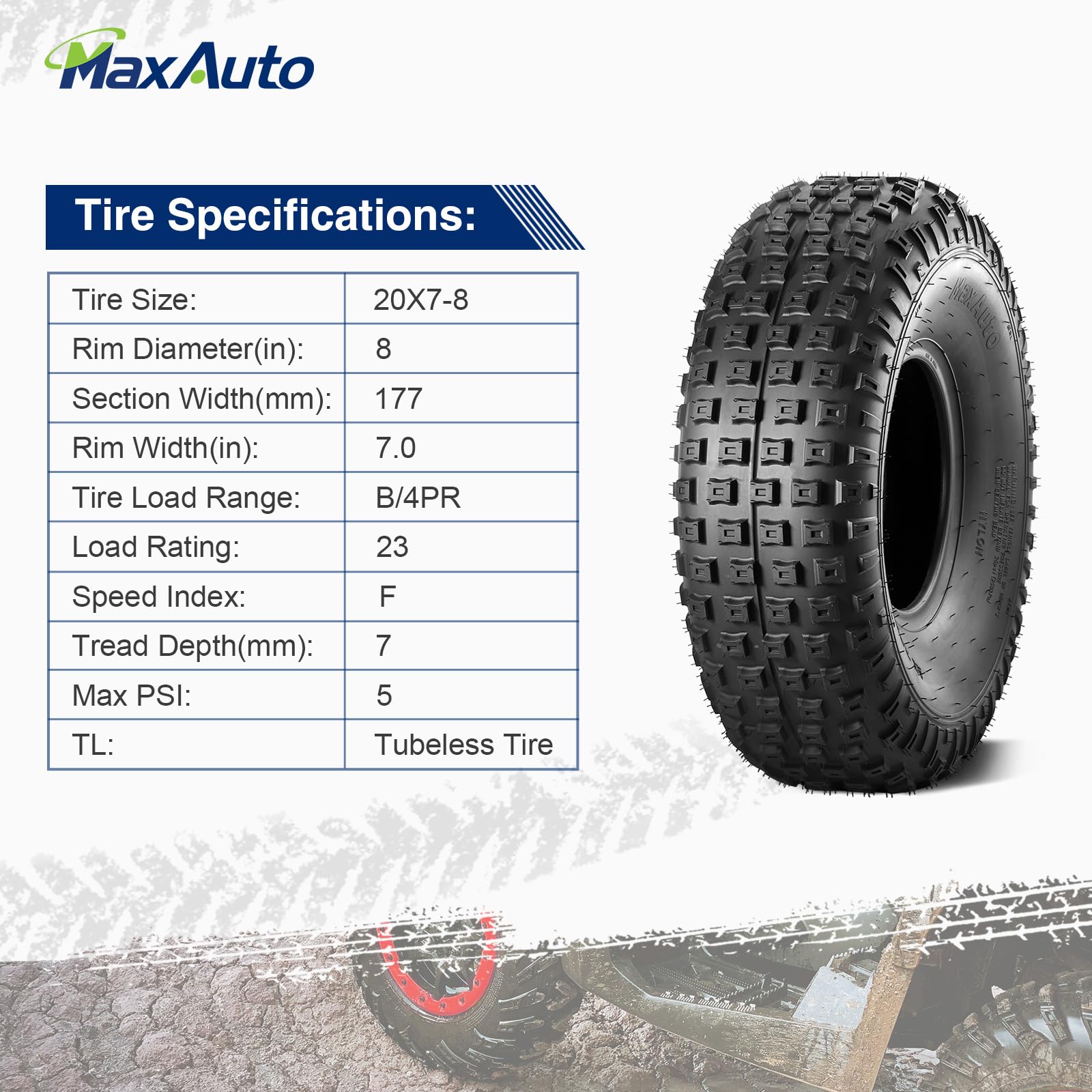 MaxAuto AT20x7-8 Sport ATV Tires 20x7x8 Quad Tires, 4 PR Tubeless All Terrain UTV Tire, 2 Pack