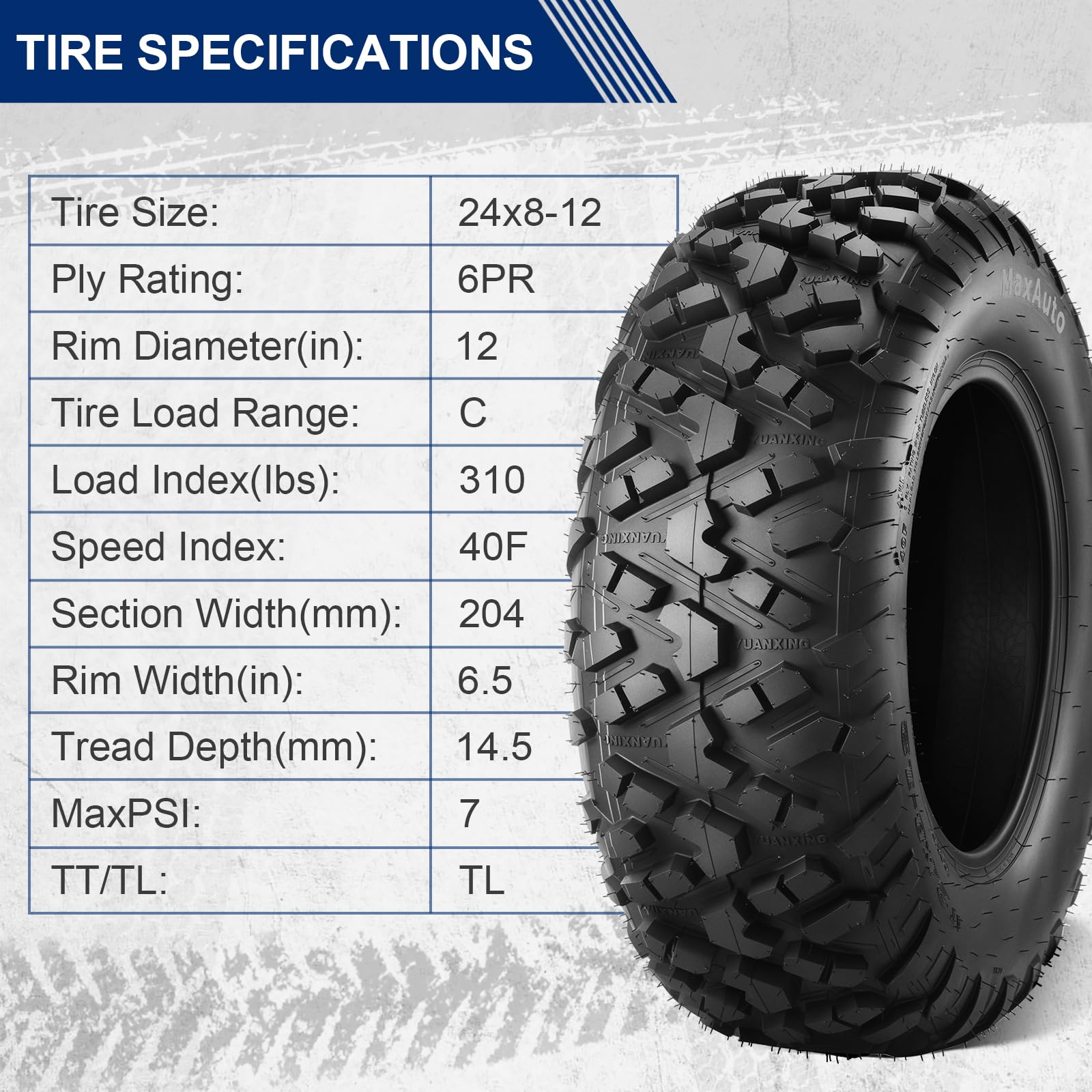 ă24x8-12 Mud TiresăUTV Tires 24x8x12--Rim Width: 6.5â, Tread Depth: 14.5MM, Max Load:310lbs@7psi,Speed Index:40F,6PR/Load Range C. Not For Highway Service.