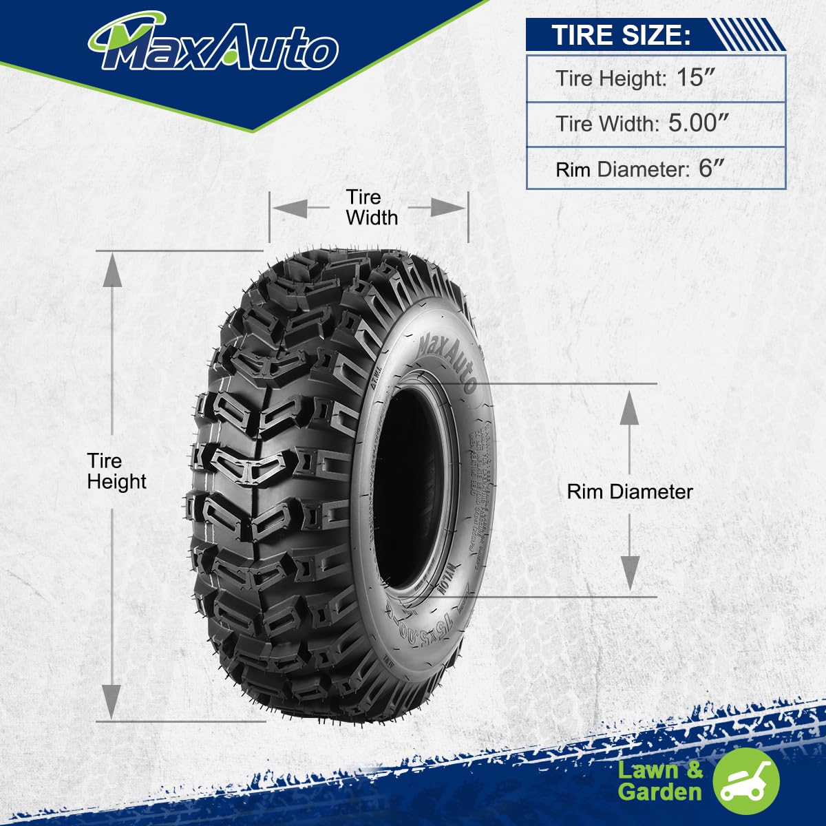 - 【Parameter】Tire Size: 15X5-6", Tire Load Range: 2PR/A, Tread Depth: 0.55"/14mm, Rim Width:3.5", Section Width: 4.7"/120mm, Overall Diameter: 14.04"/360mm, Max Load: 405lbs@20psi. Non-Highway service.