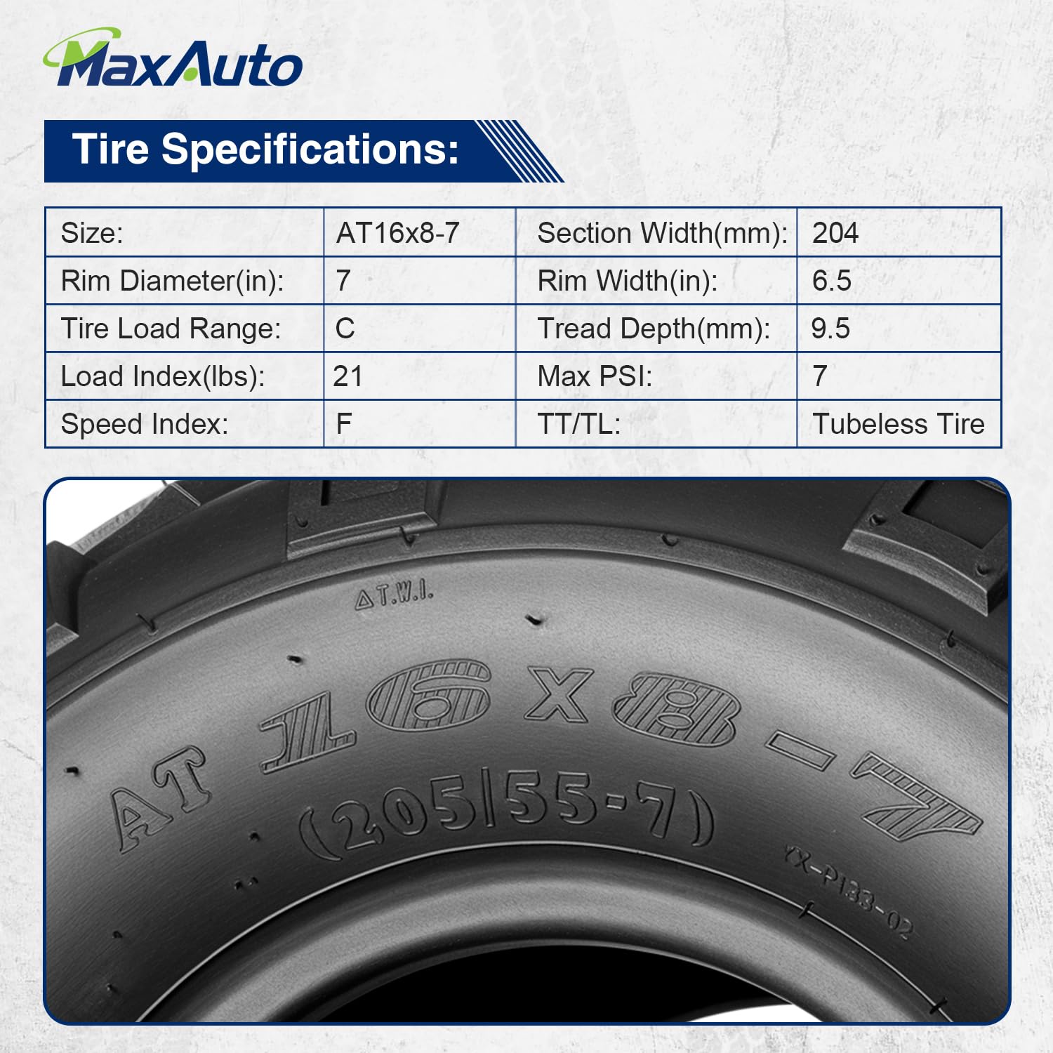 - Tire Parameters: Size: 16x8-7, tread depth: 0.37"; rim width: 6.5”; tubeless; max load; 180 lbs; load/speed index: 21F; psi: 7 (Please check the original tire size before purchasing)